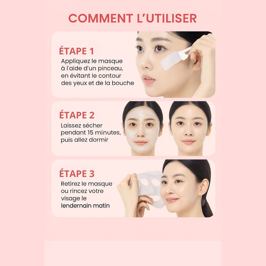 Au réveil, retirez délicatement le masque en le soulevant par les bords, ou rincez à l’eau tiède pour révéler une peau fraîche, lisse et intensément hydratée.